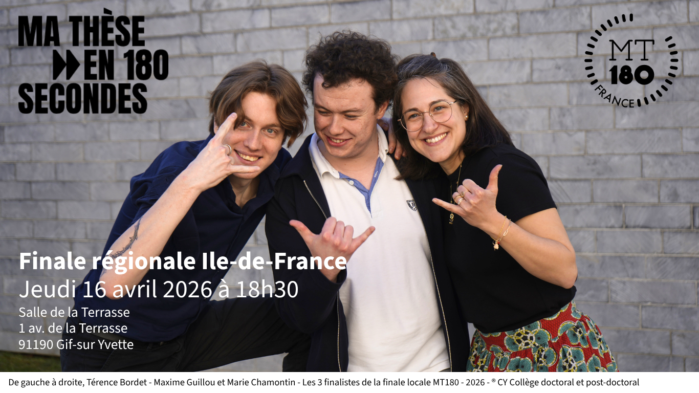 A l'occasion de la finale régionale Ile-de-France de Ma Thèse en 180 secondes (MT180) qui se tiendra le jeudi 16 avril 2026 à Gif-sur Yvette, CY Cergy Paris Université vous invite à venir encourager nos trois lauréats, Térence Bordet, Maxime Guillou et Marie Chamontin, sélectionnés lors de la finale locale.